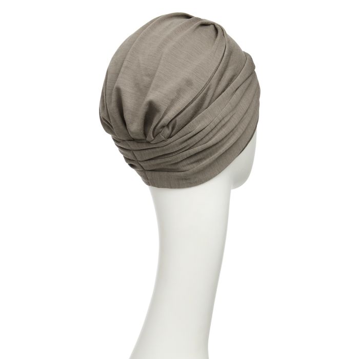 O turbante tem um caimento excelente e as belas pregas na parte de trás do chapéu conferem um belo volume à volta da cabeça.