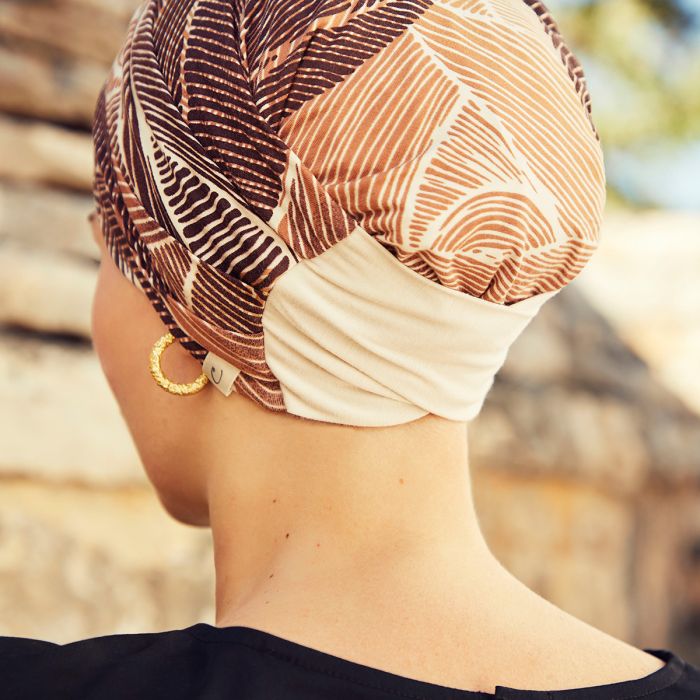 Dica de estilo: Você sabia que o detalhe em cruz do turbante Amia pode ser usado para prender uma fita solta? Como o detalhe em cruz não é totalmente fixo, você pode facilmente passar uma fita combinando por ele e criar um penteado lindo. Esta é uma solução inteligente e maravilhosa se você gosta de um turbante de bambu Caretech®, mas também tem curiosidade de usar as fitas longas.
