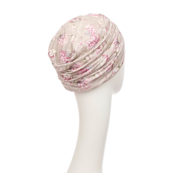 A flor é presa ao turbante, e as pregas decorativas ao longo do modelo complementam qualquer look, do esportivo ao feminino.
