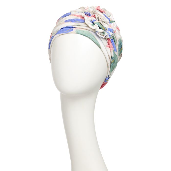 A flor é presa ao turbante, e as pregas decorativas ao longo do modelo complementam qualquer look, do esportivo ao feminino.