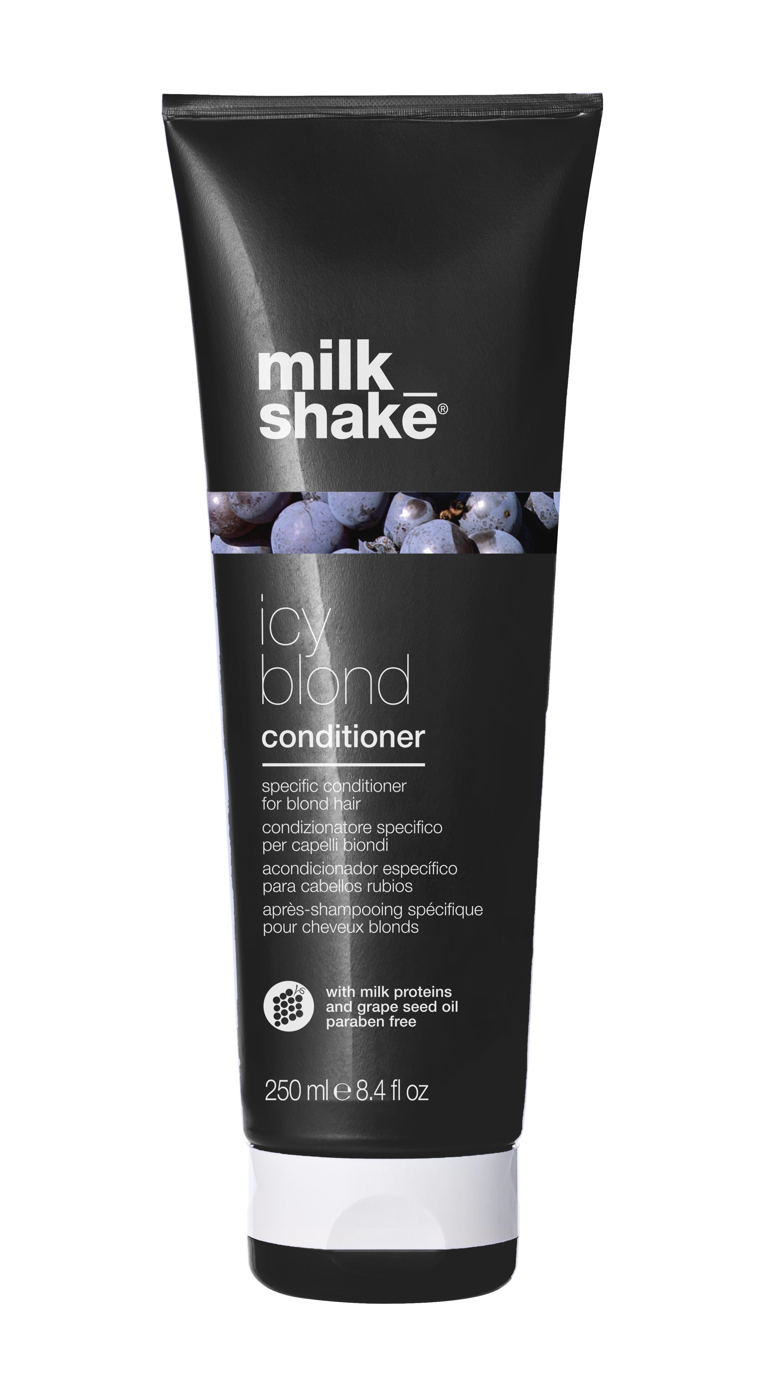 Transforme cabelos loiros ou clareados com o condicionador milk_shake® icy blond – a solução definitiva para manter tons frios e acinzentados. Este condicionador anti-amarelamento é formulado com um pigmento preto exclusivo que neutraliza os tons quentes e acobreados em cabelos loiros, clareados ou grisalhos.