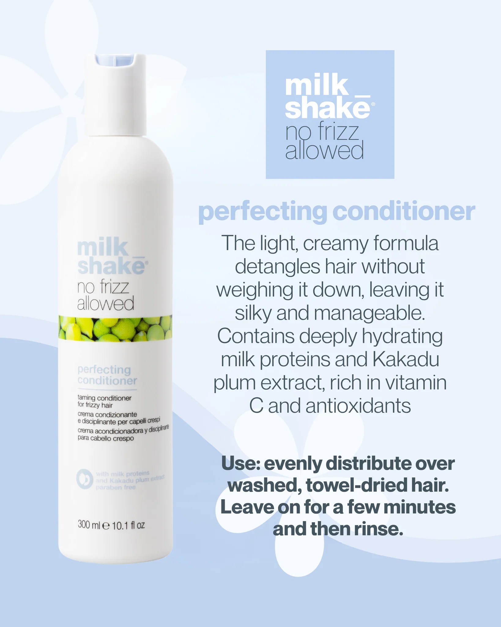 Após a lavagem com o Milk Shake Haircare No Frizz Allowed Perfecting Shampoo, distribua uniformemente sobre o cabelo limpo e seco com uma toalha.