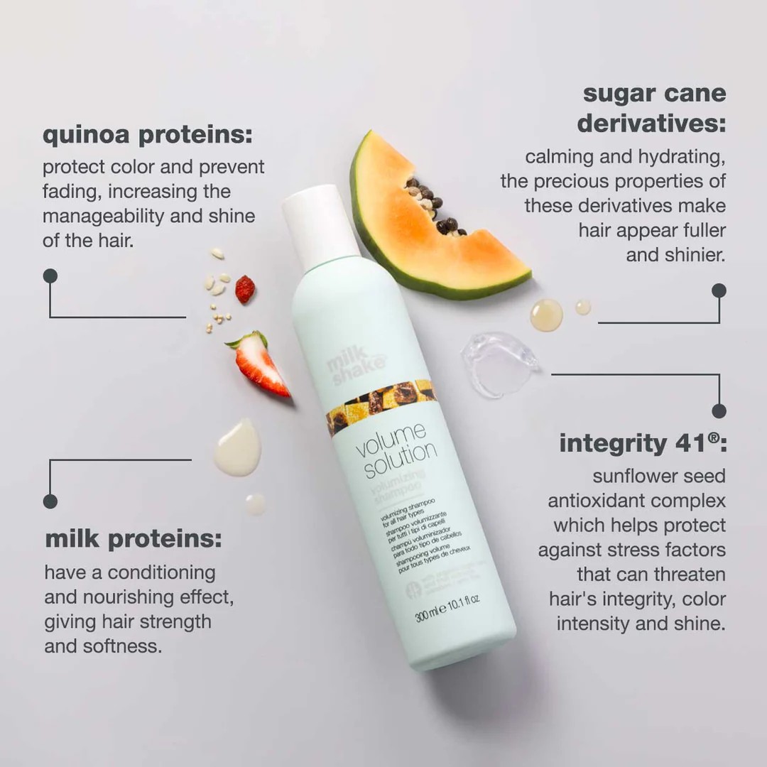 milk_shake® Volume Solution é um champô para cabelos sem vida e sem volume.