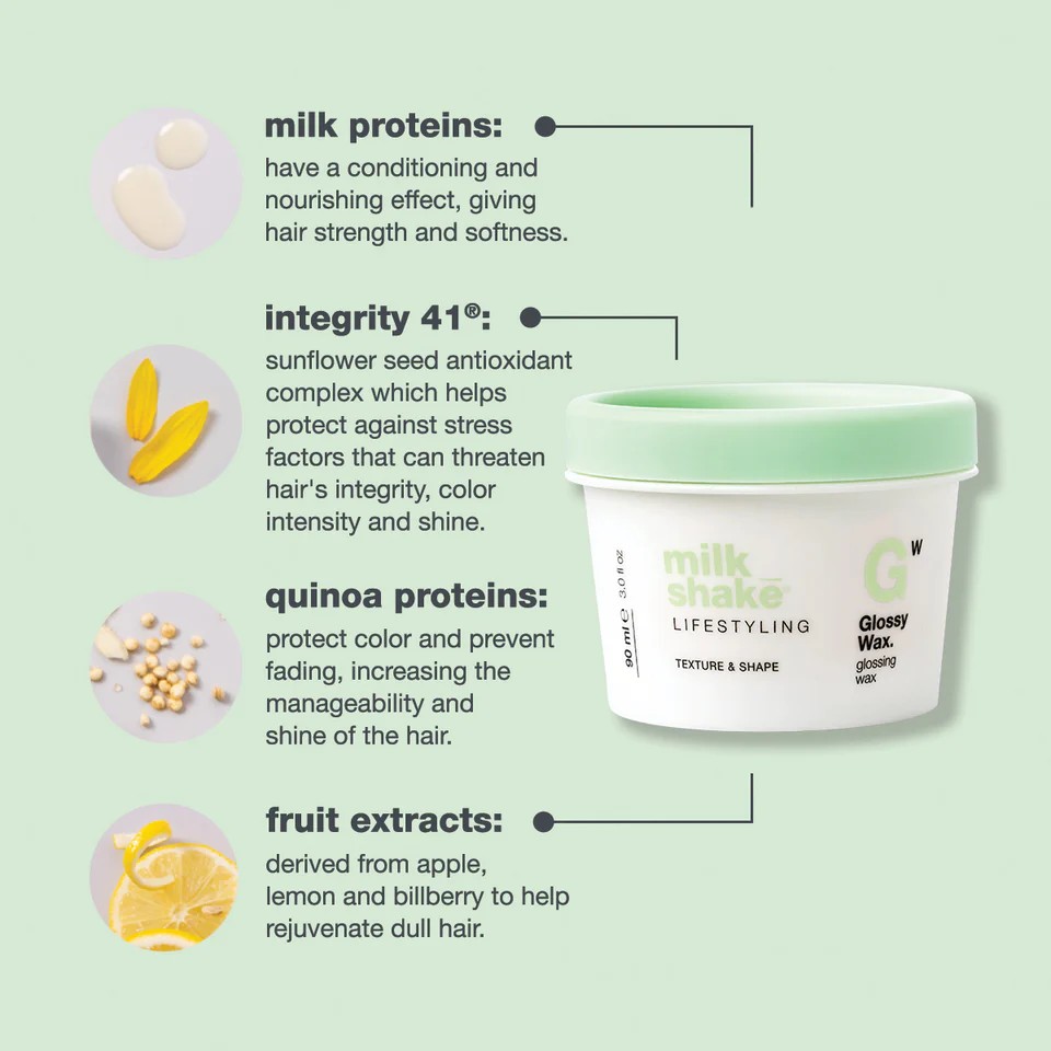Adicione fixação flexível e brilho perfeito aos seus penteados diários com milk_shake® glossy wax, o toque final definitivo para um cabelo polido e definido.