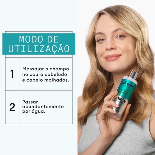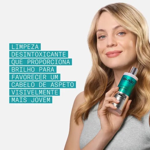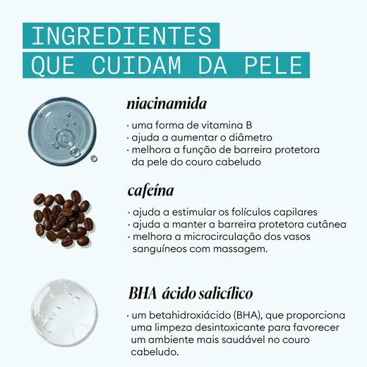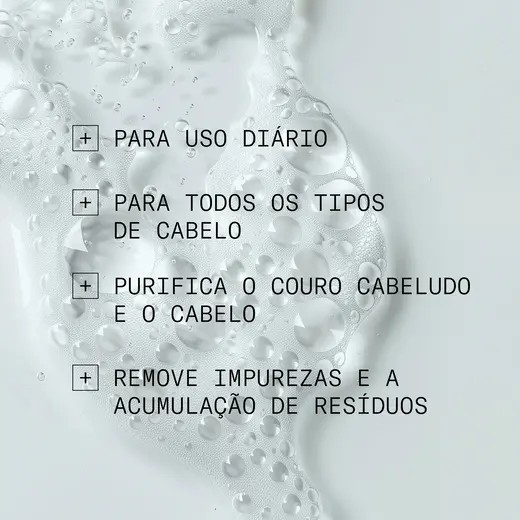 Champô, purifica o couro cabeludo e atua sobre os primeiros sinais de cabelos brancos e envelhecimento capilar, melhorando a densidade e o brilho.