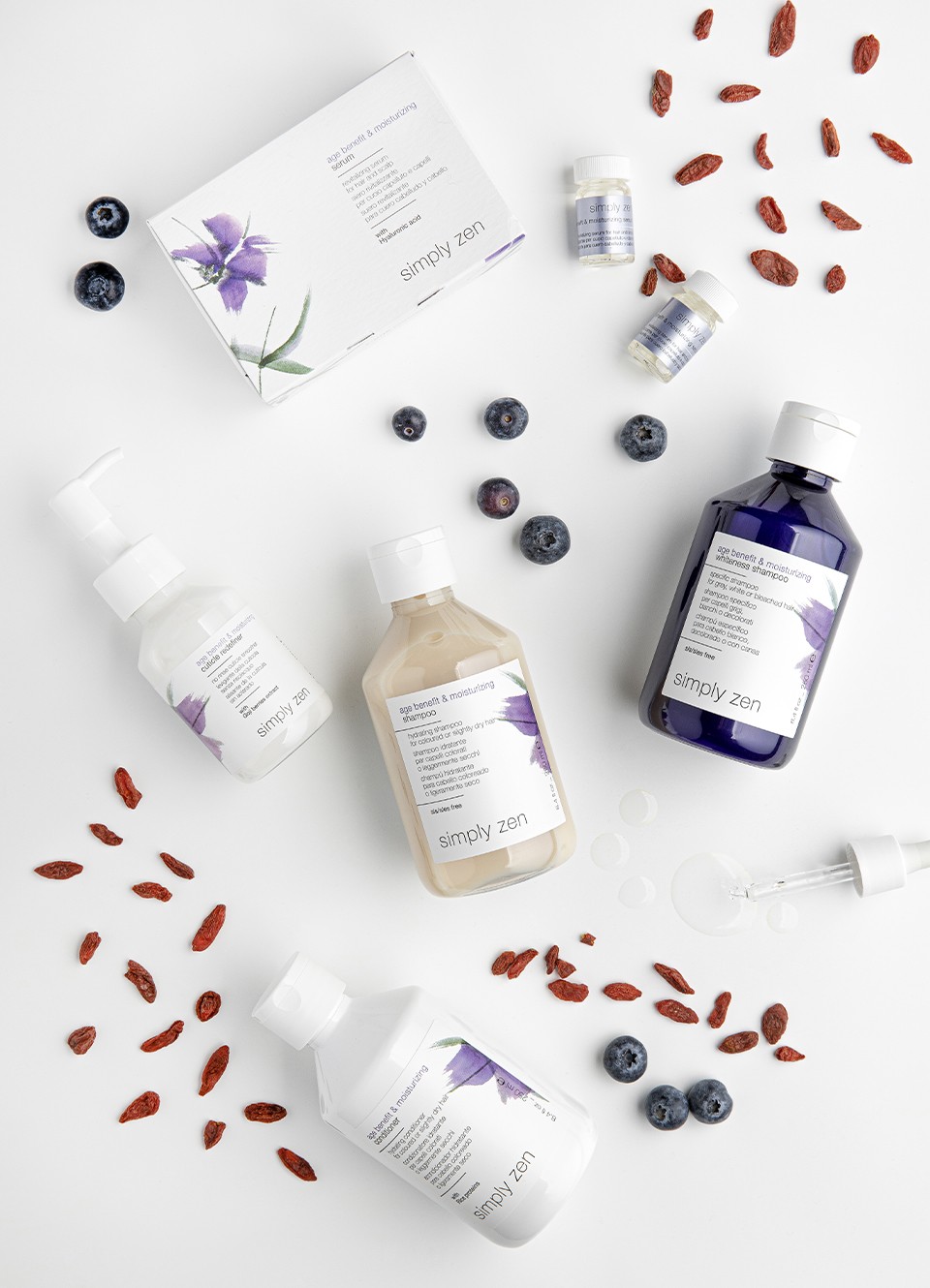 UV filters, hydrolyzed glycosaminoglycans, goji berry extract, hyaluronic acid, distilled water from mallow leaves, blueberry extract, specific violet pigment, rice proteins, grape seed oil.